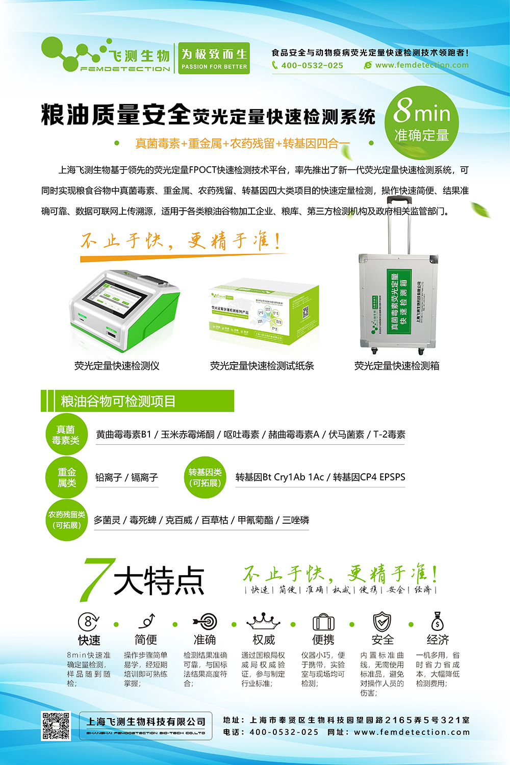 上海飛測生物真菌毒素+重金屬+農藥殘留三合一檢測儀,可有效檢測糧食谷物中重金屬鉛、鎘、汞、鉻。真菌毒素(嘔吐毒素、玉米赤霉烯酮、AFB1等)、農藥殘留等指標,快速、準確、定量檢測,適用于地方糧庫、糧食加工企業、及各地監管部門。
