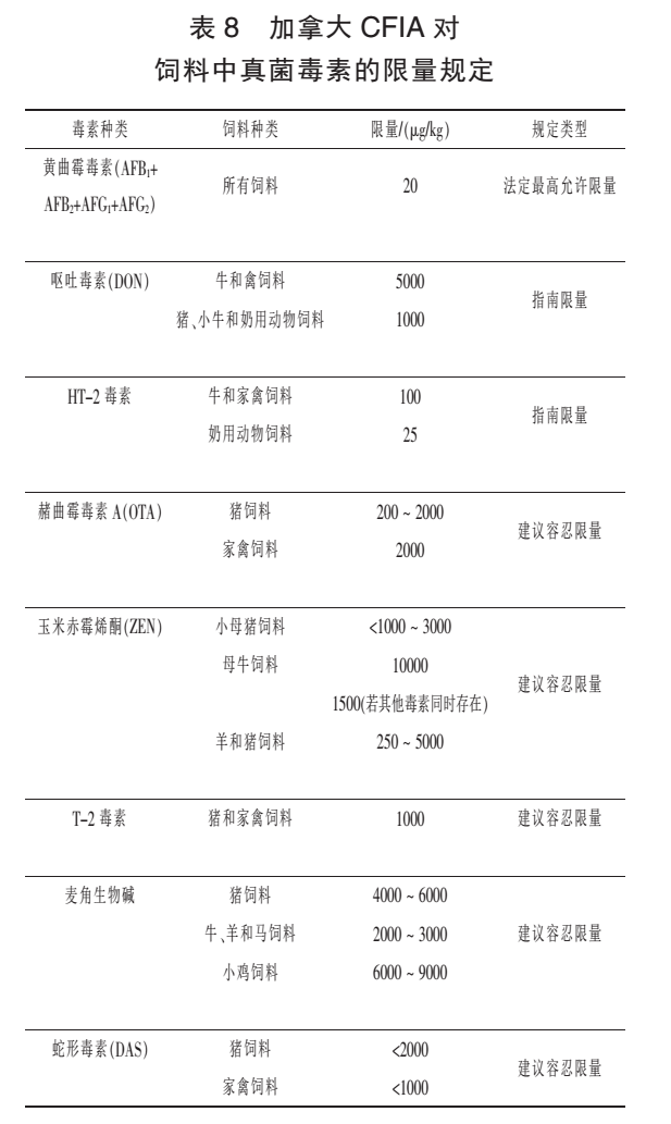 四、加拿大飼料中真菌毒素的限量標(biāo)準(zhǔn)加拿大食品檢驗(yàn)署(CFIA)發(fā)布的RG-8法規(guī)規(guī)定了飼料中黃曲霉毒素的最高允許限量,對其他真菌毒素提出了指南限量或建議容忍限量(CFIA,2000)。