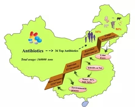 此前估算,中國每年抗生素總使用量在15萬噸到20萬噸之間,約占全世界總使用量的50%。抗生素進入環境生態系統,主要源自醫療行業和養殖畜牧業大量使用抗生素。