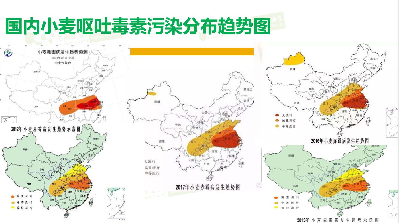 Q 玉米的嘔吐毒素和小麥的嘔吐毒素,產生原理及預防區別大嗎? 產生原理基本一樣,因為不同谷物中鐮刀菌的生長條件一樣,預防也一樣,其實很難預防,主要取決于天氣狀況。
