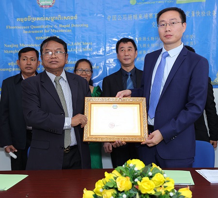 2019年12月5日,在中國農(nóng)業(yè)農(nóng)村部專家、中國駐柬埔寨使領(lǐng)館參贊、柬埔寨農(nóng)林漁業(yè)部官員及專家的見證下,在柬埔寨農(nóng)林漁業(yè)局檢測中心舉行了上海飛測生物科技有限公司(南京微測全資子公司)真菌毒素快速檢測箱的捐贈儀式,并進(jìn)行了相關(guān)的技術(shù)交流和培訓(xùn),簽訂了相關(guān)合作協(xié)議,為雙方以后的深入合作奠定了良好的基礎(chǔ)。